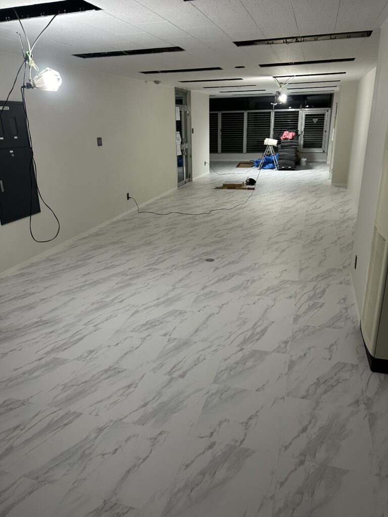 - 大理石調の床材が映え、空間全体に高級感と清潔感が生まれました。照明が反射することで床の表情も際立ち、明るく上品な雰囲気に仕上がっています。