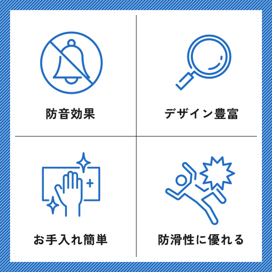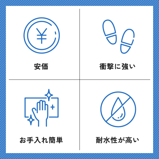 強度が高く土足にも対応しているため、ビルやマンションの共用部分、店舗や公共施設で選ばれています。