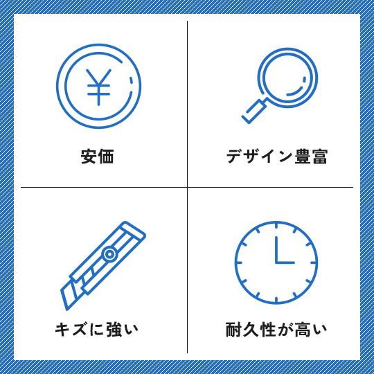 表面が硬質な分、エンボス(凹凸)加工による質感の再現性が高く、木目調や石目調といったデザインが豊富。